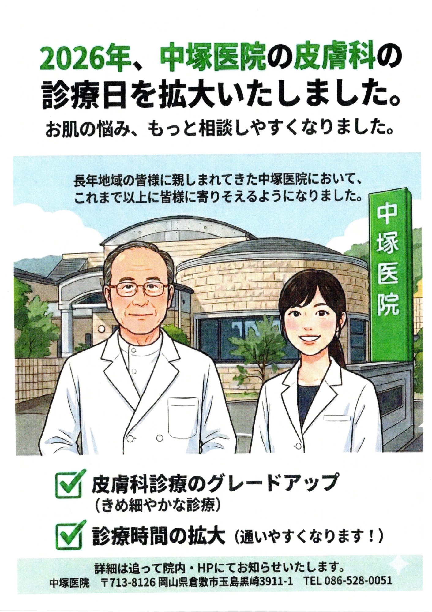 TEL 086-528-0051*月・木・土曜日午前、皮膚科外来しています(第2・第4土曜日は休診です)*通所リハビリの見学は随時受付中*発熱・カゼの症状がある方は、来院前に電話してください。